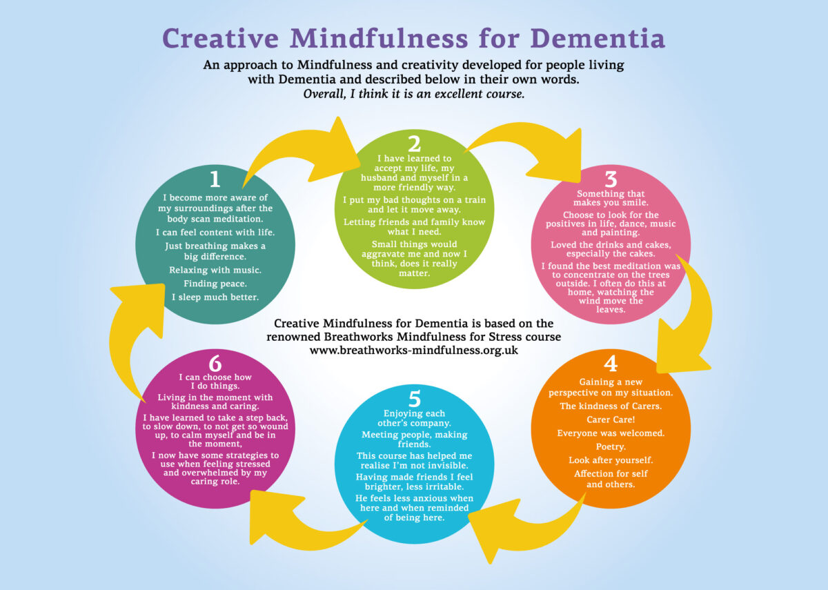 Creative Mindfulness for Dementia Courses in 2023 and 2024, based on the renowned Breathworks Mindfulness for Stress course were described as “excellent” and increased every participant’s sense of wellbeing.