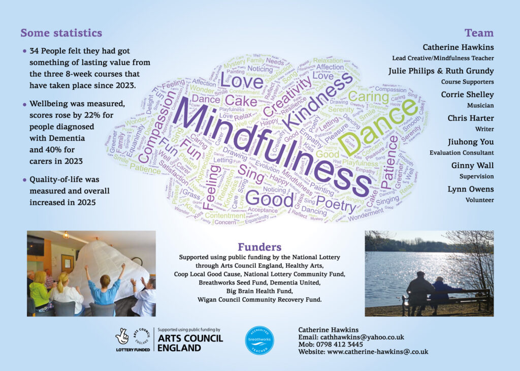 The third Creative Mindfulness for Dementia took place in September and October 2025. Following this I created a new information poster about the course using the words of participants and the Breathworks six stage process outline that underlies its two courses, including that this course is based on Mindfulness for Stress.